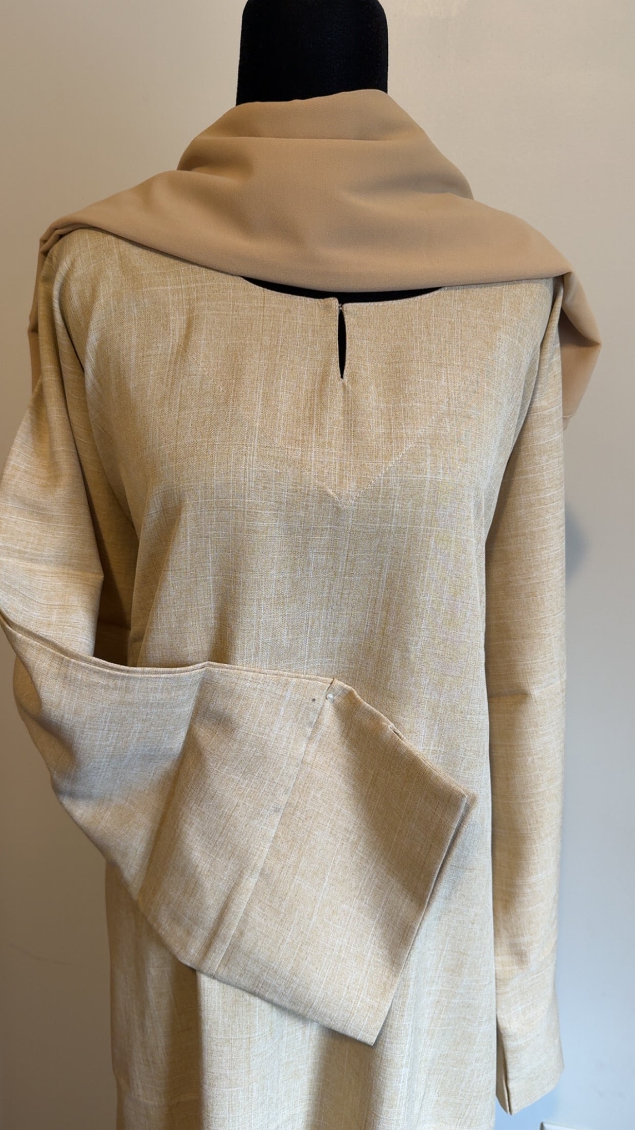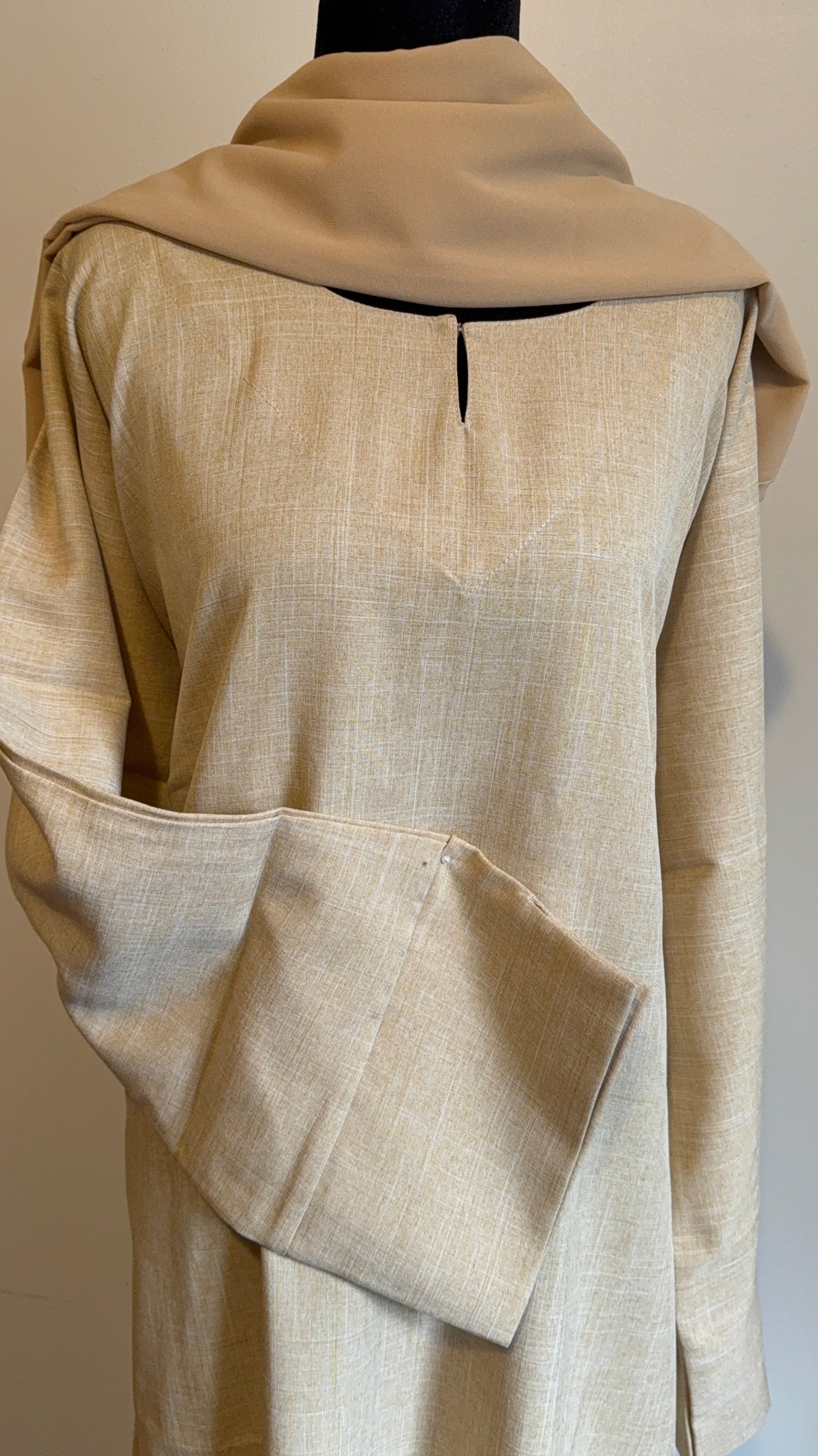 The Golden Dune abaya is crafted from breathable linen with practical pockets and includes a lightweight chiffon hijab for a refined, comfortable look.