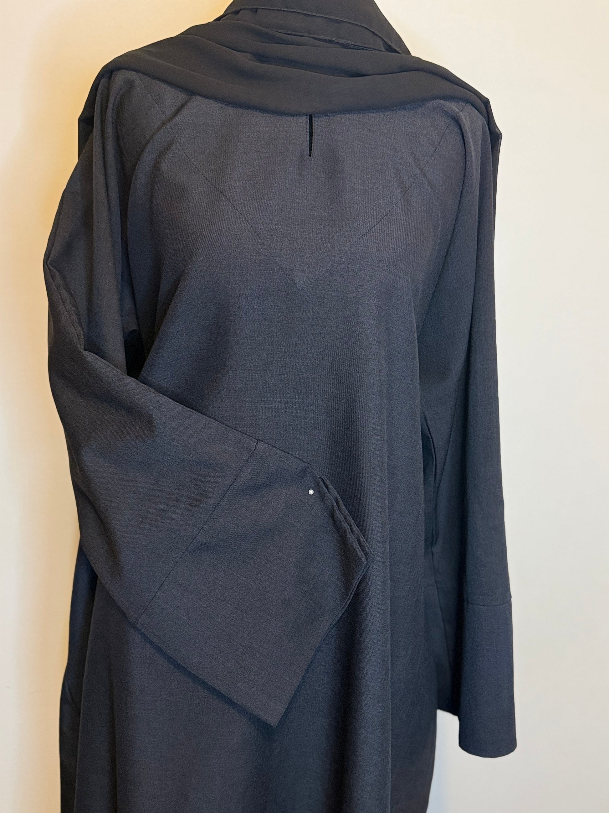 The Midnight abaya is crafted from breathable black linen, offering comfort and elegance. It includes two practical pockets for convenience. Paired with a matching chiffon hijab, this set delivers a refined, cohesive look suitable for both everyday wear and special occasions.