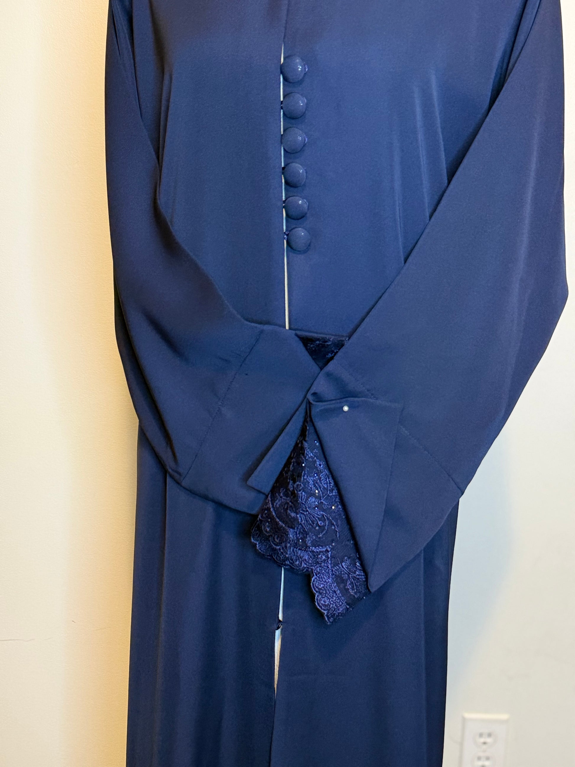 This dark blue open abaya features delicate lace detailing on the sleeves, combining elegance with a lightweight, breathable design for refined comfort and style.